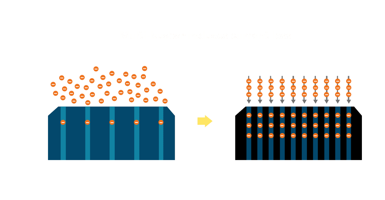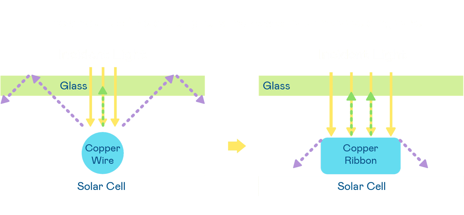• 电池使用多条铜导线 (Copper wire) 于电池片上形成较短的电流路径,,,,提高电流收集效率,,,采用圆形设计的铜导线较传统扁平式的铜焊带 (Ribbon),,,,可增加入射至电池的光线量。。。