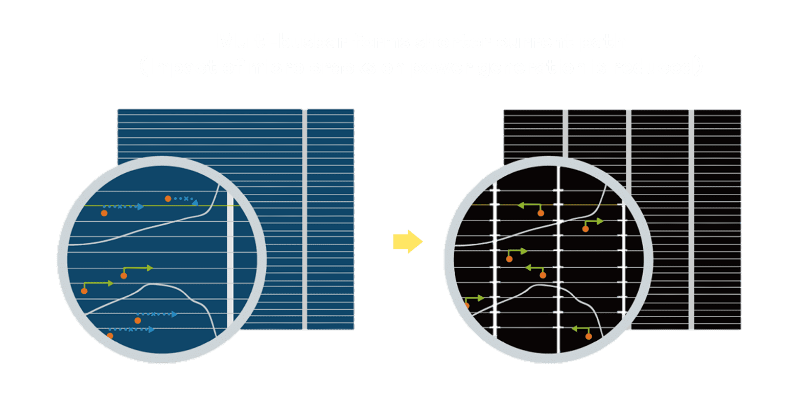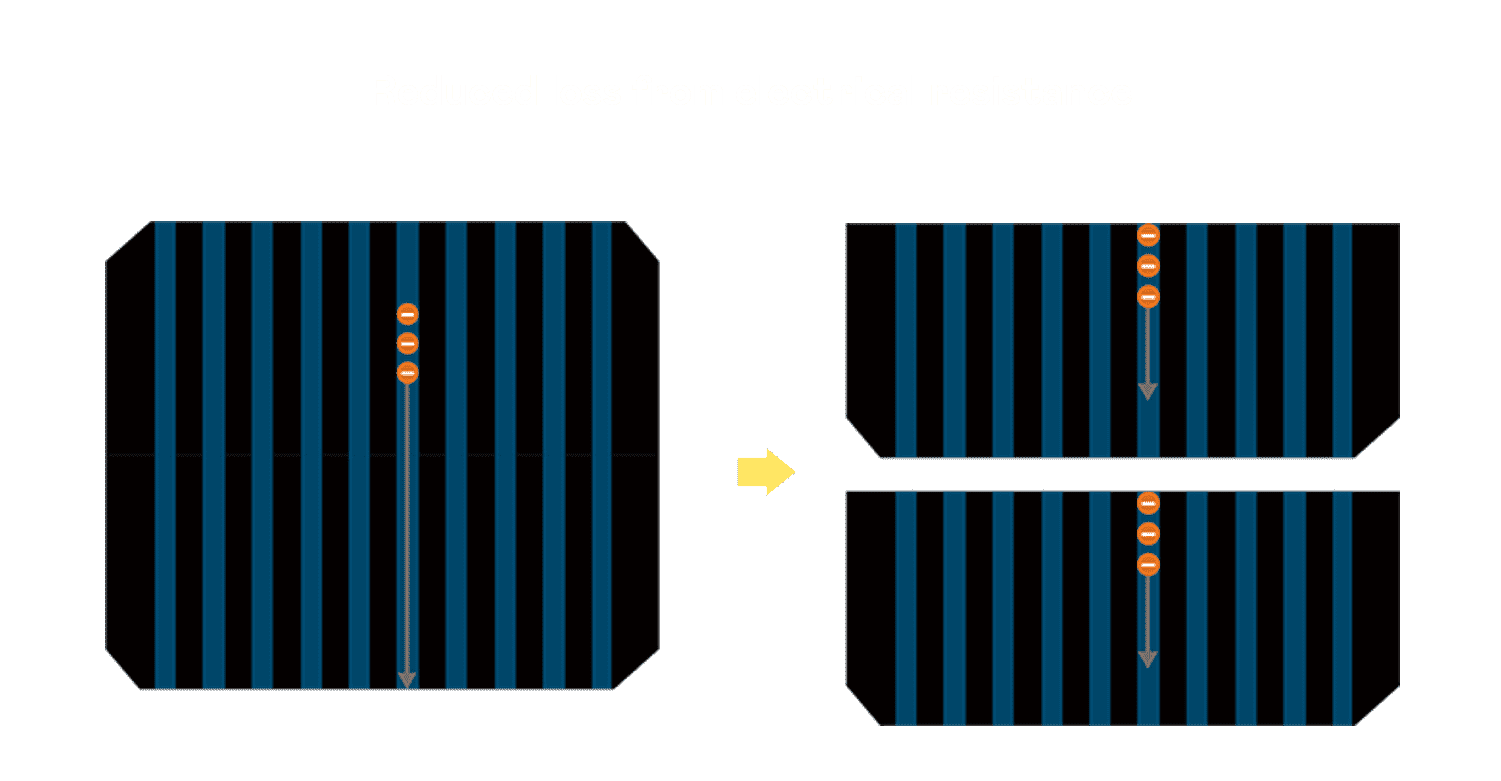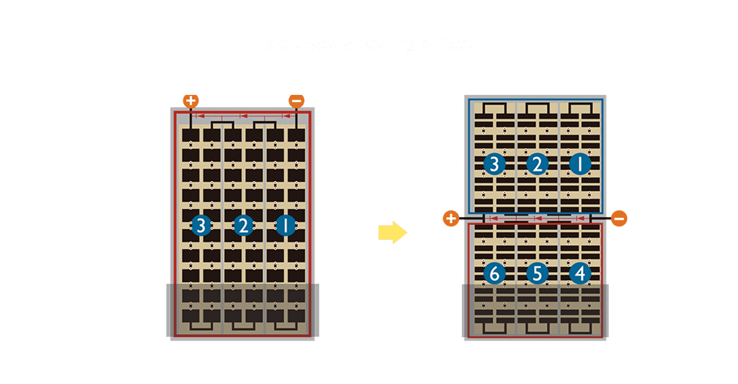 • 结合半切电池,,,降低遮阴影响、、、、提升模组抗隐裂能力、、、并减少电阻损耗,,,进一步提升模组发电效能。。。。