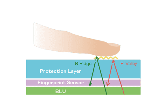 TFT 指纹扫描感测技术利用薄膜电晶体 (TFT) 当作光感测元件,,藉由非晶硅 (a-Si) 与低温多晶硅(LTPS)既有光电转换特性对不同波段光源进行吸收,,,使感测 IC 读取阵列感测元件的光漏电差异,,转换成数位灰阶影像。。
